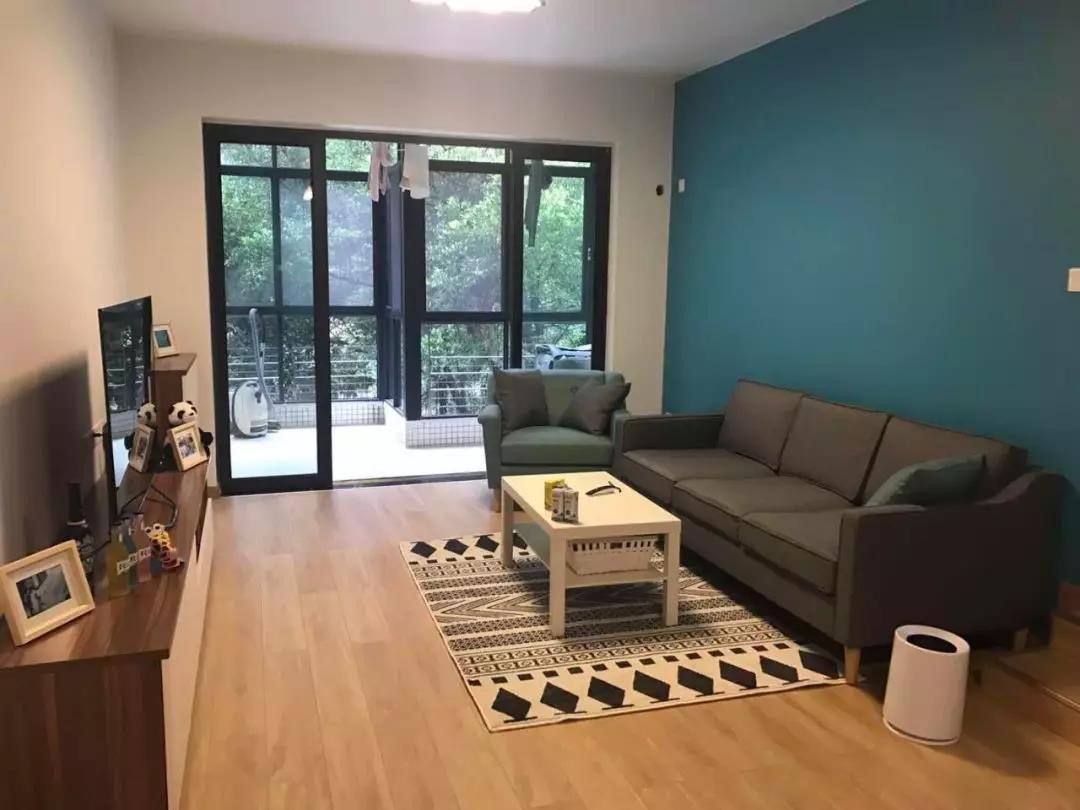 極簡復古的裝修風格,沙發與茶幾線條利落、明朗,一大面深海藍沙發背景墻與陽臺綠蔭環繞的景色相映襯,搭配頂固閃晾DM35智能晾衣機的謳歌紅,整個家變得輕奢大氣。