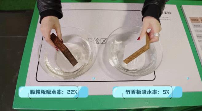在竹香板和顆粒板的側(cè)面分別滴上一滴水,然后湊近樣品閉眼感受它們散發(fā)的氣味。此時你會發(fā)現(xiàn),顆粒板木味混雜,略顯刺鼻,而竹香板則自帶一陣淡淡的竹子清香,十分清新。
